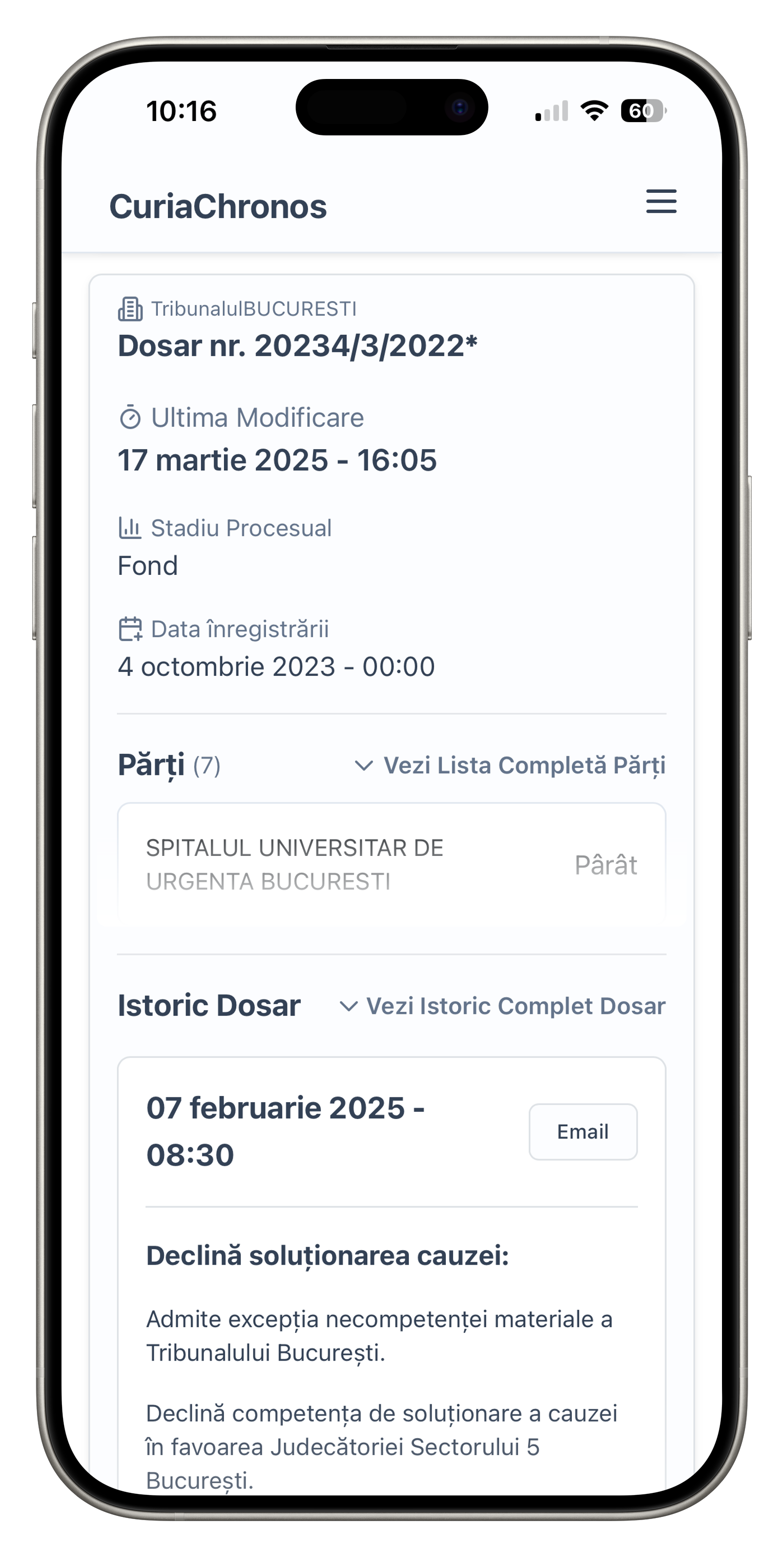 CuriaChronos te anunță automat atunci când apar orice modificări în dosare și când urmează termenul dosarului tău. Nu trebuie să verifici nimic manual, deoarece ești mereu cu un pas înainte.